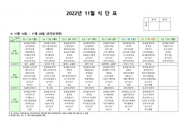 11월 셋째주 식단표 페이지 정보 작성자 은천노인복지회 작성일22-11-10 10:10 조회83,192회 댓글0건 관련링크 이전글 다음글 목록 답변 본문 . 이전글 다음글 목록 답변