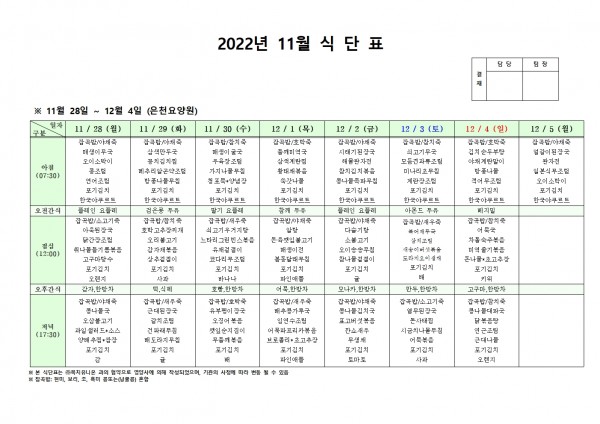 11월 넷째주 식단표 페이지 정보 작성자 은천노인복지회 작성일22-11-24 16:56 조회82,909회 댓글0건 관련링크 이전글 다음글 목록 답변 본문 . 이전글 다음글 목록 답변
