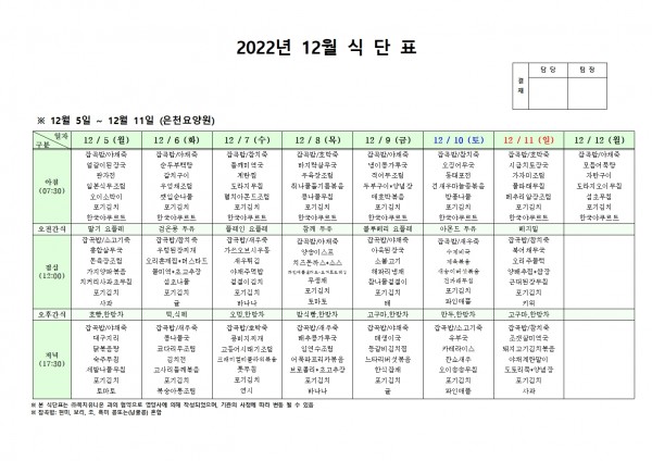 12월 첫째주 식단표 페이지 정보 작성자 은천노인복지회 작성일22-12-01 17:14 조회81,534회 댓글0건 관련링크 이전글 다음글 목록 답변 본문 . 이전글 다음글 목록 답변