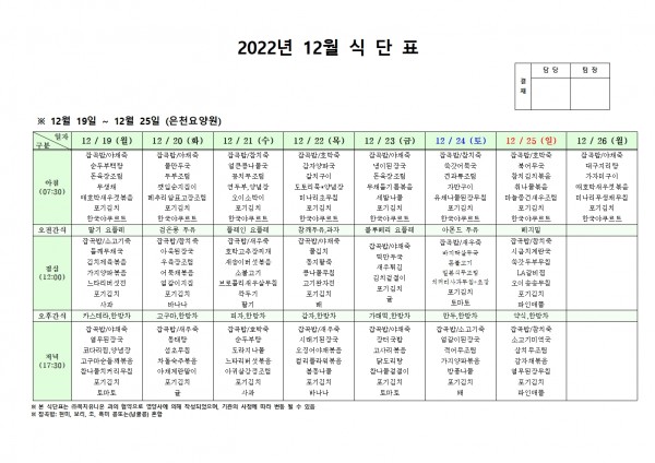 12월 셋째주 식단표 페이지 정보 작성자 은천노인복지회 작성일22-12-16 15:00 조회80,213회 댓글0건 관련링크 이전글 다음글 목록 답변 본문 . 이전글 다음글 목록 답변
