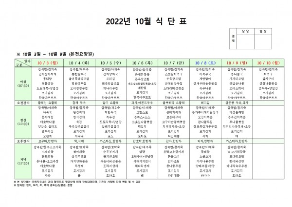 10월 첫째주 식단표 페이지 정보 작성자 은천노인복지회 작성일22-10-04 09:59 조회87,355회 댓글0건 관련링크 이전글 다음글 목록 답변 본문 . 이전글 다음글 목록 답변
