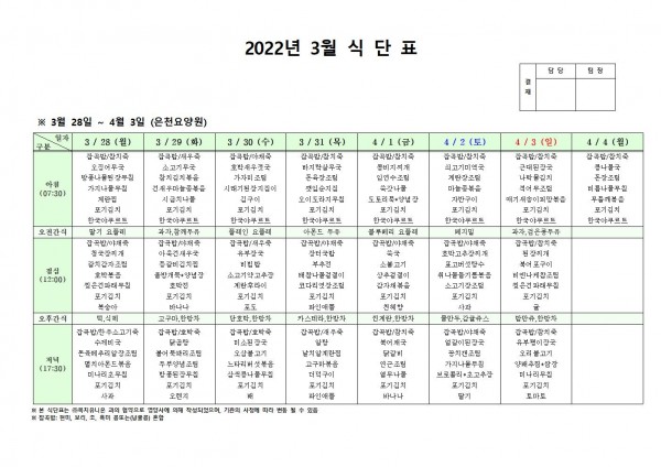 3월 다섯째주 식단표 페이지 정보 작성자 은천노인복지회 작성일22-03-25 10:40 조회104,729회 댓글0건 관련링크 이전글 다음글 목록 답변 본문 . 이전글 다음글 목록 답변