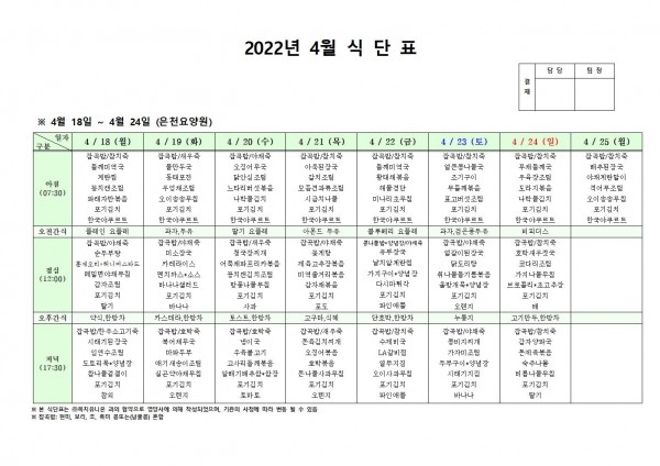 4월 셋째주 식단표 페이지 정보 작성자 은천노인복지회 작성일22-04-14 17:03 조회101,820회 댓글0건 관련링크 이전글 다음글 목록 답변 본문 . 이전글 다음글 목록 답변