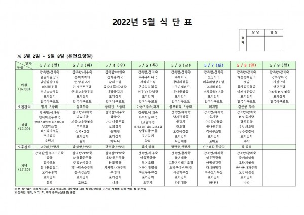 5월 첫째주 식단표 페이지 정보 작성자 은천노인복지회 작성일22-04-29 10:35 조회100,058회 댓글0건 관련링크 이전글 다음글 목록 답변 본문 . 이전글 다음글 목록 답변