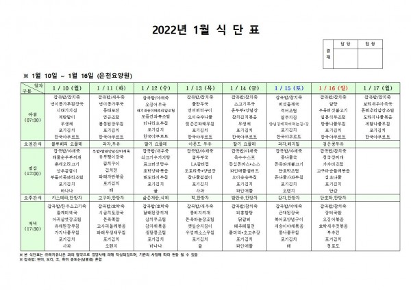 1월 둘째주 식단표 페이지 정보 작성자 은천노인복지회 작성일22-01-07 10:03 조회112,975회 댓글0건 관련링크 이전글 다음글 목록 답변 본문 . 이전글 다음글 목록 답변