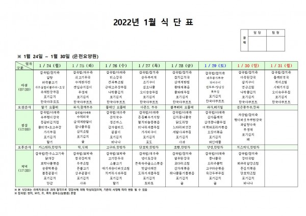 1월 넷째주 식단표 페이지 정보 작성자 은천노인복지회 작성일22-01-25 09:24 조회111,960회 댓글0건 관련링크 이전글 다음글 목록 답변 본문 . 이전글 다음글 목록 답변