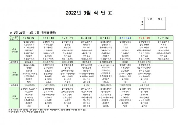 3월 첫째주 식단표 페이지 정보 작성자 은천노인복지회 작성일22-02-25 09:22 조회108,230회 댓글0건 관련링크 이전글 다음글 목록 답변 본문 . 이전글 다음글 목록 답변