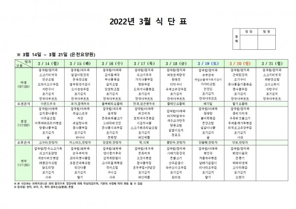 3월 셋째주 식단표 페이지 정보 작성자 은천노인복지회 작성일22-03-11 16:43 조회106,352회 댓글0건 관련링크 이전글 다음글 목록 답변 본문 . 이전글 다음글 목록 답변