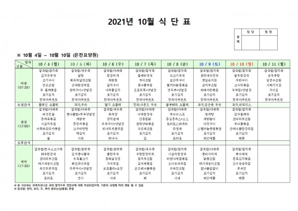 10월 첫째주 식단표 페이지 정보 작성자 은천노인복지회 작성일21-09-30 16:01 조회119,441회 댓글0건 관련링크 이전글 다음글 목록 답변 본문 . 이전글 다음글 목록 답변