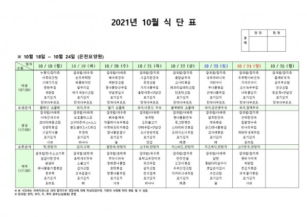 10월 셋째주 식단표 페이지 정보 작성자 은천노인복지회 작성일21-10-14 16:24 조회118,060회 댓글0건 관련링크 이전글 다음글 목록 답변 본문 . 이전글 다음글 목록 답변