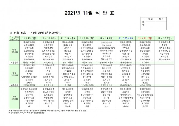 11월 셋째주 식단표 페이지 정보 작성자 은천노인복지회 작성일21-11-25 17:11 조회117,833회 댓글0건 관련링크 이전글 다음글 목록 답변 본문 . 이전글 다음글 목록 답변