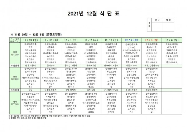 12월 첫째주 식단표 페이지 정보 작성자 은천노인복지회 작성일21-11-25 17:12 조회116,592회 댓글0건 관련링크 이전글 다음글 목록 답변 본문 . 이전글 다음글 목록 답변
