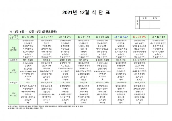 12월 둘째주 식단표 페이지 정보 작성자 은천노인복지회 작성일21-12-03 10:52 조회115,424회 댓글0건 관련링크 이전글 다음글 목록 답변 본문 . 이전글 다음글 목록 답변
