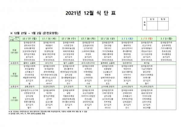 12월 다섯째주 식단표 페이지 정보 작성자 은천노인복지회 작성일21-12-23 17:14 조회114,178회 댓글0건 관련링크 이전글 다음글 목록 답변 본문 . 이전글 다음글 목록 답변