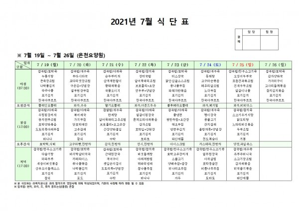 7월 셋째주 식단표 페이지 정보 작성자 은천노인복지회 작성일21-07-22 11:18 조회124,686회 댓글0건 관련링크 이전글 다음글 목록 답변 본문 . 이전글 다음글 목록 답변
