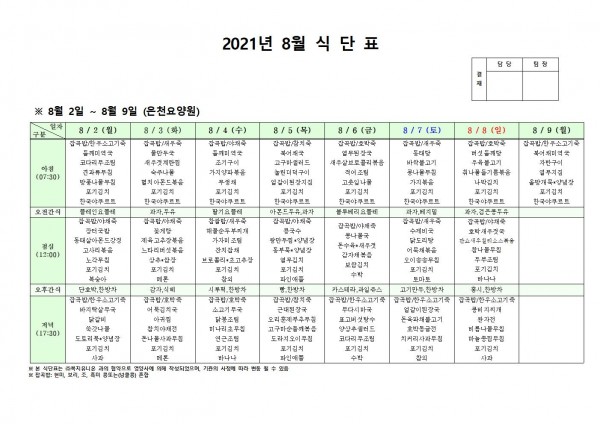 8월 첫째주 식단표 페이지 정보 작성자 은천노인복지회 작성일21-08-05 10:26 조회123,787회 댓글0건 관련링크 이전글 다음글 목록 답변 본문 . 이전글 다음글 목록 답변