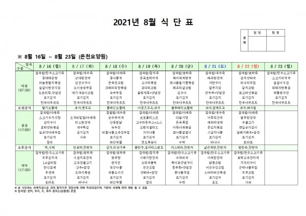 8월 셋째주 식단표 페이지 정보 작성자 은천노인복지회 작성일21-08-12 17:43 조회122,813회 댓글0건 관련링크 이전글 다음글 목록 답변 본문 . 이전글 다음글 목록 답변