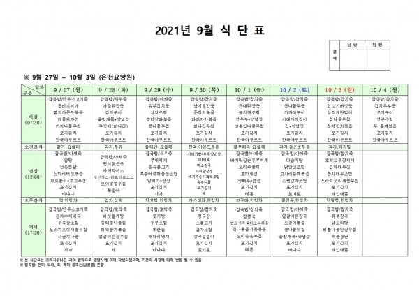 9월 넷째주 식단표 페이지 정보 작성자 은천노인복지회 작성일21-09-30 16:00 조회119,711회 댓글0건 관련링크 이전글 다음글 목록 답변 본문 . 이전글 다음글 목록 답변