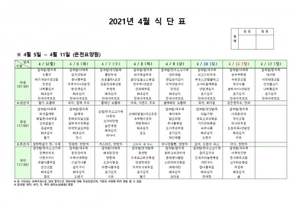 4월 첫째주 식단표 페이지 정보 작성자 은천노인복지회 작성일21-04-01 18:24 조회133,724회 댓글0건 관련링크 이전글 다음글 목록 답변 본문 4월 첫째주 식단표 이전글 다음글 목록 답변