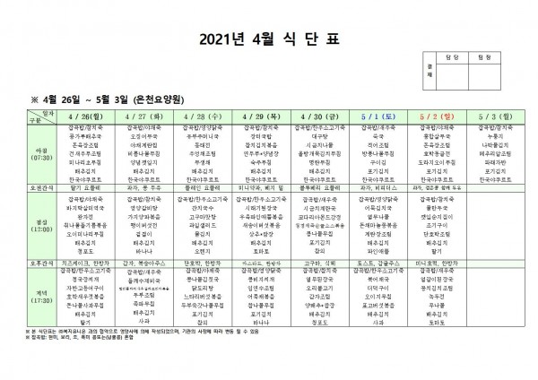 4월 넷째주 식단표 페이지 정보 작성자 은천노인복지회 작성일21-04-22 18:32 조회130,522회 댓글0건 관련링크 이전글 다음글 목록 답변 본문 식단표 이전글 다음글 목록 답변
