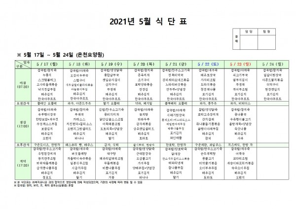 5월 셋째주 식단표 페이지 정보 작성자 은천노인복지회 작성일21-05-13 19:27 조회128,706회 댓글0건 관련링크 이전글 다음글 목록 답변 본문 5월 셋째주 식단표 이전글 다음글 목록 답변