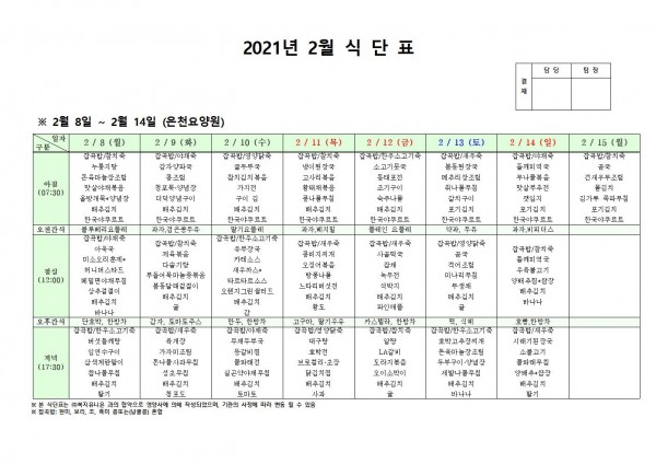 2월 둘째주 식단표 페이지 정보 작성자 은천노인복지회 작성일21-02-04 17:45 조회139,953회 댓글0건 관련링크 이전글 다음글 목록 답변 본문 . 이전글 다음글 목록 답변