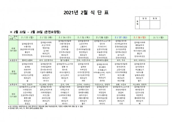 2월 넷째주 식단표 페이지 정보 작성자 은천노인복지회 작성일21-02-19 12:05 조회137,253회 댓글0건 관련링크 이전글 다음글 목록 답변 본문 2월 4주 식단표 [이 게시물은 은천노인복지회님에 의해 2021-03-12 17:18:24 공지사항에서 이동 됨] 이전글 다음글 목록 답변