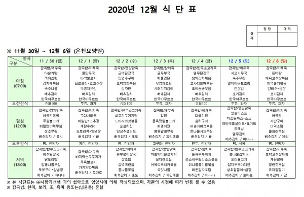 12월 첫째주 식단표 페이지 정보 작성자 은천노인복지회 작성일20-12-08 18:10 조회146,048회 댓글0건 관련링크 이전글 다음글 목록 답변 본문 . 이전글 다음글 목록 답변