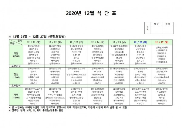 12월 넷째주 식단표 페이지 정보 작성자 은천노인복지회 작성일20-12-21 17:39 조회145,199회 댓글0건 관련링크 이전글 다음글 목록 답변 본문 . 이전글 다음글 목록 답변