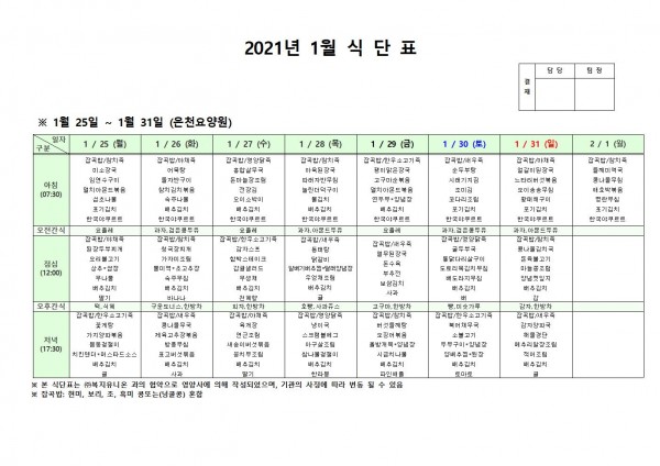 1월 넷째주 식단표 페이지 정보 작성자 은천노인복지회 작성일21-01-22 10:43 조회140,661회 댓글0건 관련링크 이전글 다음글 목록 답변 본문 . 이전글 다음글 목록 답변