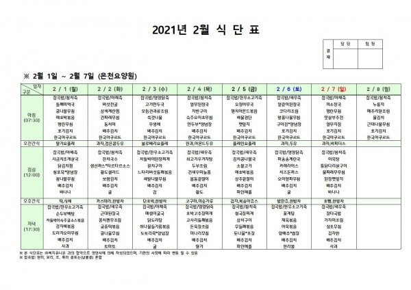 2월 첫째주 식단표 페이지 정보 작성자 은천노인복지회 작성일21-01-28 17:45 조회140,412회 댓글0건 관련링크 이전글 다음글 목록 답변 본문 . 이전글 다음글 목록 답변