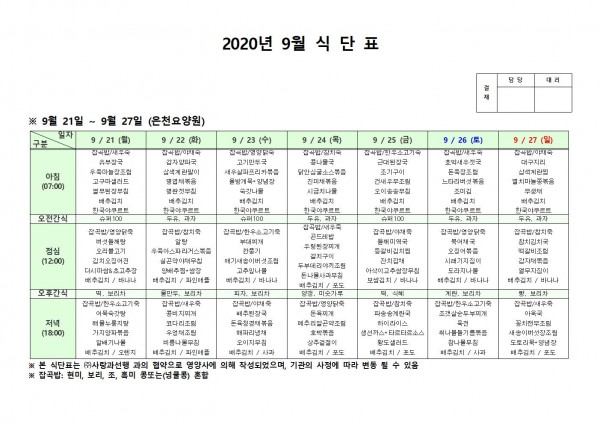 9월 넷째주 식단표 페이지 정보 작성자 은천노인복지회 작성일20-10-12 14:45 조회152,953회 댓글0건 관련링크 이전글 다음글 목록 답변 본문 . 이전글 다음글 목록 답변