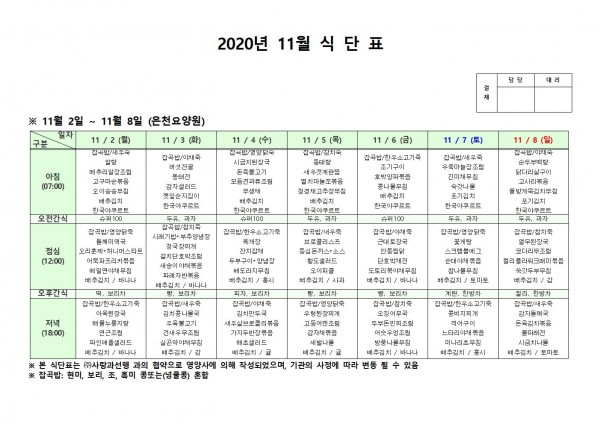 11월 첫째주 식단표 페이지 정보 작성자 은천노인복지회 작성일20-11-13 13:47 조회148,916회 댓글0건 관련링크 이전글 다음글 목록 답변 본문 . 이전글 다음글 목록 답변