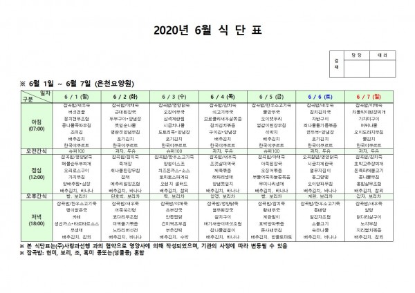 6월 첫째주 식단표 페이지 정보 작성자 은천노인복지회 작성일20-06-09 09:32 조회162,775회 댓글0건 관련링크 이전글 다음글 목록 답변 본문 호 이전글 다음글 목록 답변