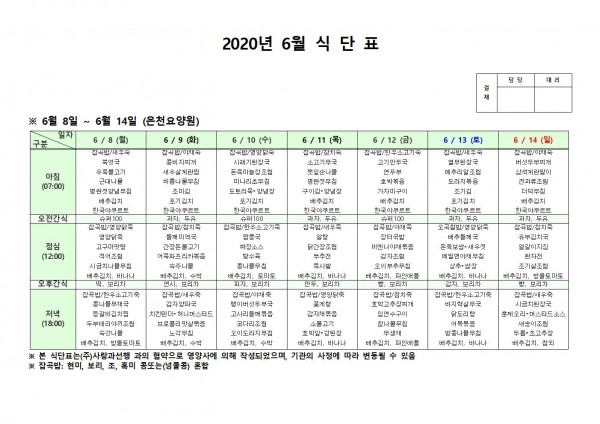 6월 둘째주 식단표 페이지 정보 작성자 은천노인복지회 작성일20-06-15 12:49 조회162,278회 댓글0건 관련링크 이전글 다음글 목록 답변 본문 ㅣ; 이전글 다음글 목록 답변