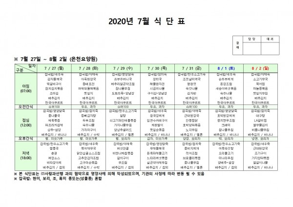 7월 다섯째주 식단표 페이지 정보 작성자 은천노인복지회 작성일20-08-10 11:32 조회157,478회 댓글0건 관련링크 이전글 다음글 목록 답변 본문 . 이전글 다음글 목록 답변