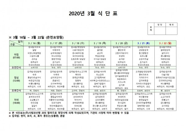 3월 셋째주 식단표 페이지 정보 작성자 은천노인복지회 작성일20-03-23 14:50 조회172,470회 댓글0건 관련링크 이전글 다음글 목록 답변 본문 . 이전글 다음글 목록 답변