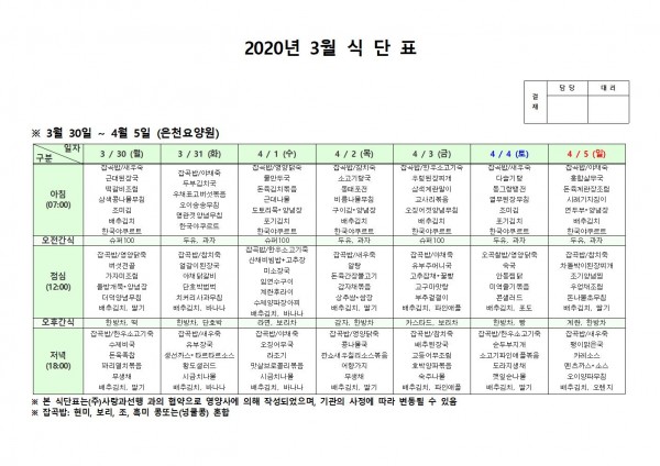 3월 다섯째주 식단표 페이지 정보 작성자 은천노인복지회 작성일20-04-06 14:47 조회170,938회 댓글0건 관련링크 이전글 다음글 목록 답변 본문 . 이전글 다음글 목록 답변