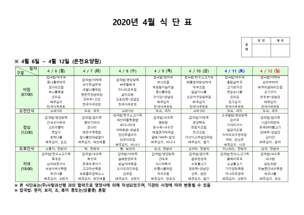 4월 첫째주 식단표 페이지 정보 작성자 은천노인복지회 작성일20-04-13 15:04 조회170,507회 댓글0건 관련링크 이전글 다음글 목록 답변 본문 . 이전글 다음글 목록 답변