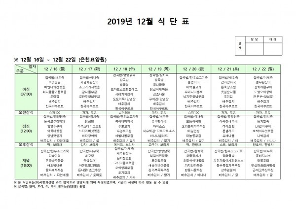 12월 셋째주 식단표 페이지 정보 작성자 은천노인복지회 작성일19-12-23 14:06 조회180,202회 댓글0건 관련링크 이전글 다음글 목록 답변 본문 12월 셋째주 식단표입니다. 이전글 다음글 목록 답변