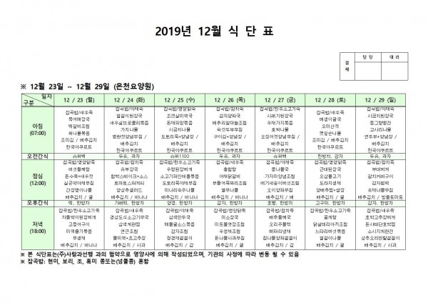 12월 넷째주 식단표 페이지 정보 작성자 은천노인복지회 작성일19-12-30 14:32 조회180,370회 댓글0건 관련링크 이전글 다음글 목록 답변 본문 12월 넷째주 식단표입니다 이전글 다음글 목록 답변