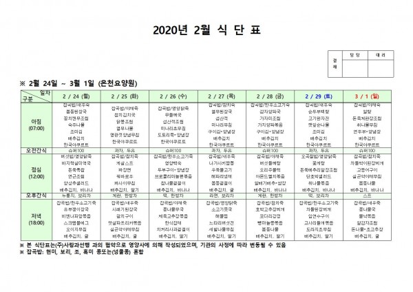 2월 넷째주 식단표 페이지 정보 작성자 은천노인복지회 작성일20-03-02 13:41 조회171,899회 댓글0건 관련링크 이전글 다음글 목록 답변 본문 2월 넷째주 식단표입니다 이전글 다음글 목록 답변