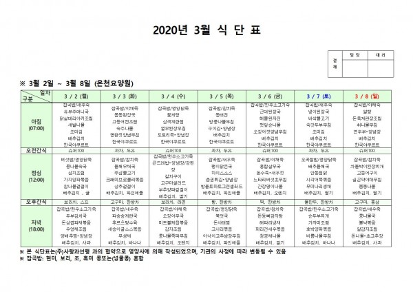 3월 첫째주 식단표 페이지 정보 작성자 은천노인복지회 작성일20-03-09 11:55 조회171,977회 댓글0건 관련링크 이전글 다음글 목록 답변 본문 . 이전글 다음글 목록 답변