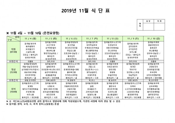 11월 첫째주 식단표 페이지 정보 작성자 은천노인복지회 작성일19-11-12 14:17 조회184,540회 댓글0건 관련링크 이전글 다음글 목록 답변 본문 11월 첫째주 식단표 이전글 다음글 목록 답변