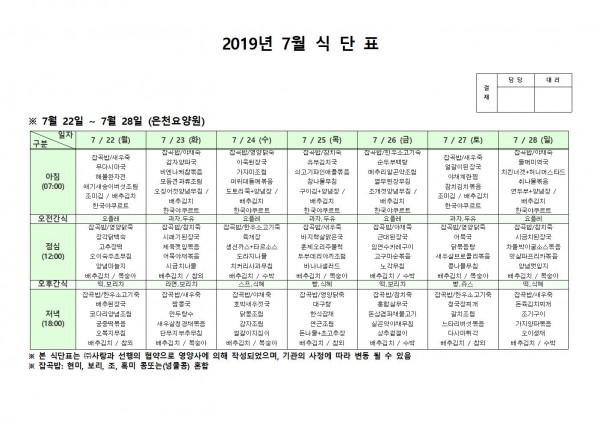 7월 넷째주 식단표 페이지 정보 작성자 은천노인복지회 작성일19-07-29 13:58 조회189,880회 댓글0건 관련링크 이전글 다음글 목록 답변 본문 7월 넷째주 식단표 이전글 다음글 목록 답변