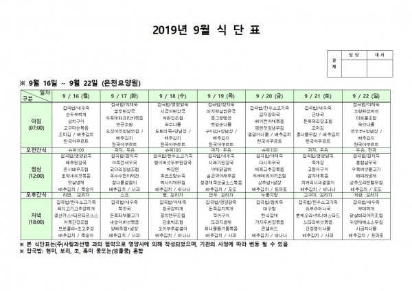 9월 셋째주 식단표 페이지 정보 작성자 은천노인복지회 작성일19-09-23 13:27 조회187,867회 댓글0건 관련링크 이전글 다음글 목록 답변 본문 . 이전글 다음글 목록 답변