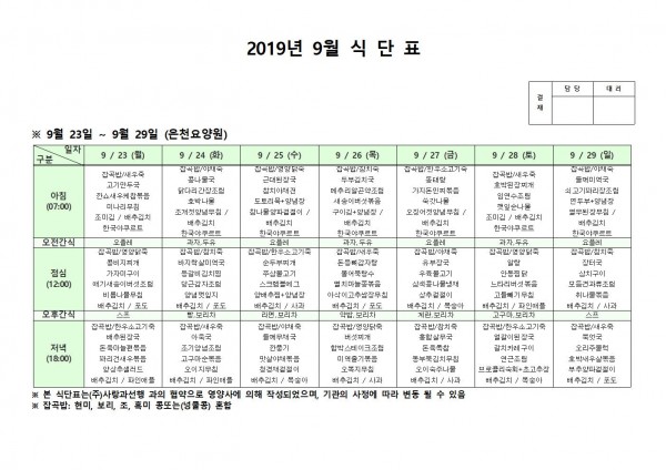 9월 넷째주 식단표 페이지 정보 작성자 은천노인복지회 작성일19-09-30 14:47 조회186,565회 댓글0건 관련링크 이전글 다음글 목록 답변 본문 9월 넷째주 식단표 이전글 다음글 목록 답변