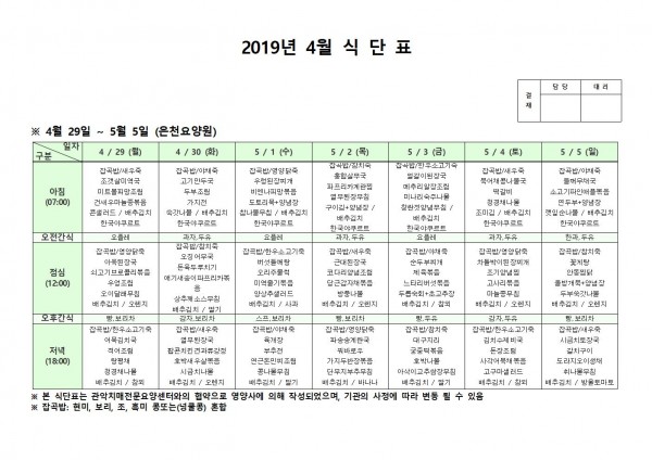 4월 다섯째주 식단표 페이지 정보 작성자 은천노인복지회 작성일19-05-07 14:13 조회196,739회 댓글0건 관련링크 이전글 다음글 목록 답변 본문 4월 다섯째주 식단표 이전글 다음글 목록 답변