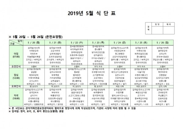 5월 셋째주 식단표 페이지 정보 작성자 은천노인복지회 작성일19-05-27 14:07 조회194,518회 댓글0건 관련링크 이전글 다음글 목록 답변 본문 5월 셋째주 식단표 이전글 다음글 목록 답변