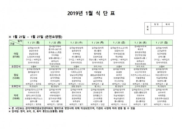 1월 셋째주 식단표 페이지 정보 작성자 은천노인복지회 작성일19-01-29 13:48 조회199,599회 댓글1건 관련링크 이전글 다음글 목록 답변 본문 1월 셋째주 식단표 이전글 다음글 목록 답변